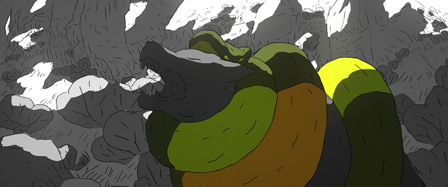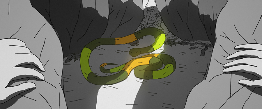 全編線描だけで、着彩されているのは蛇だけだ。ボスにへつらって生きている、ひったくり犯の兄弟はどうなるんだろう。アニメーションという手法で荒む心情をうまく表現している。